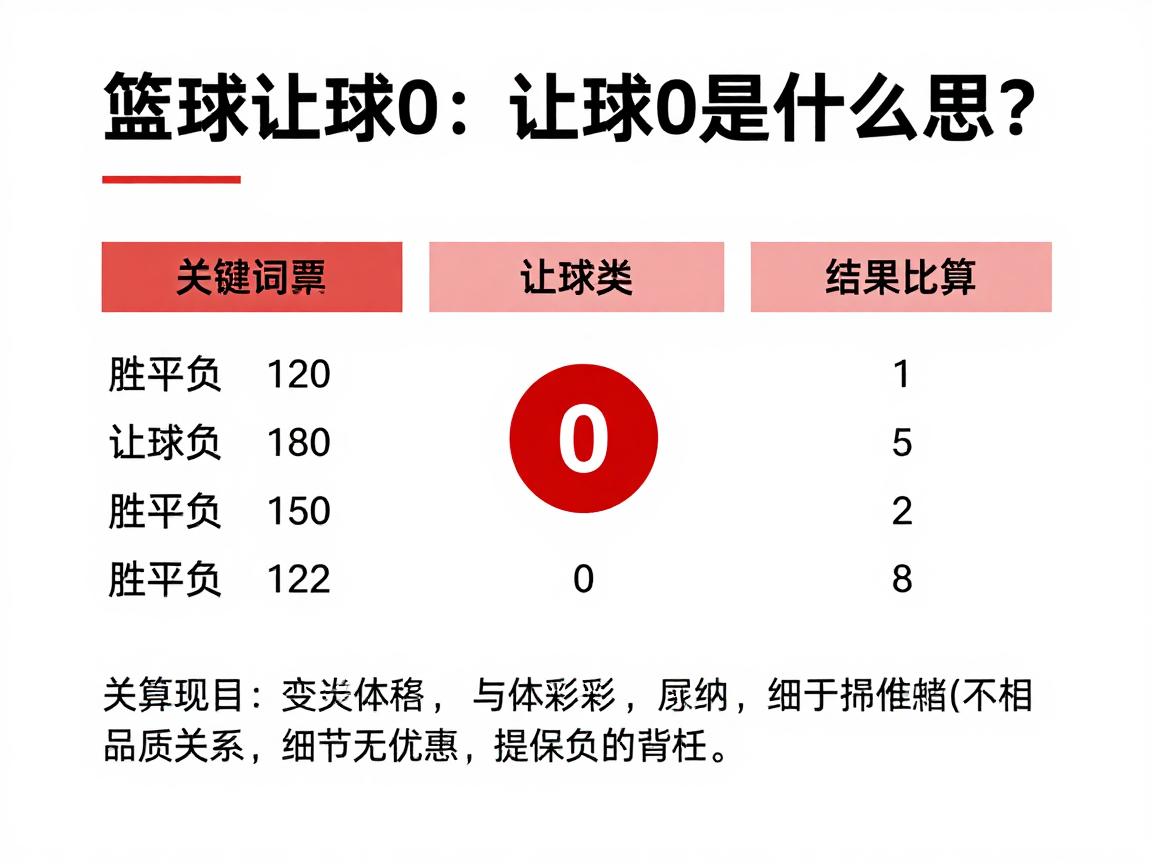 很多篮球爱好者在接触竞猜时会遇到“让球0”这个概念,心里难免产生疑问:这到底是什么意思?比赛结果又该如何计算?其实这是篮球竞猜中一个比较特殊但又十分常见的情况。作为一名有多年篮球数据分析经验的体育博主,今天就来为大家详细解析篮球让球0的奥秘,希望能帮到你。