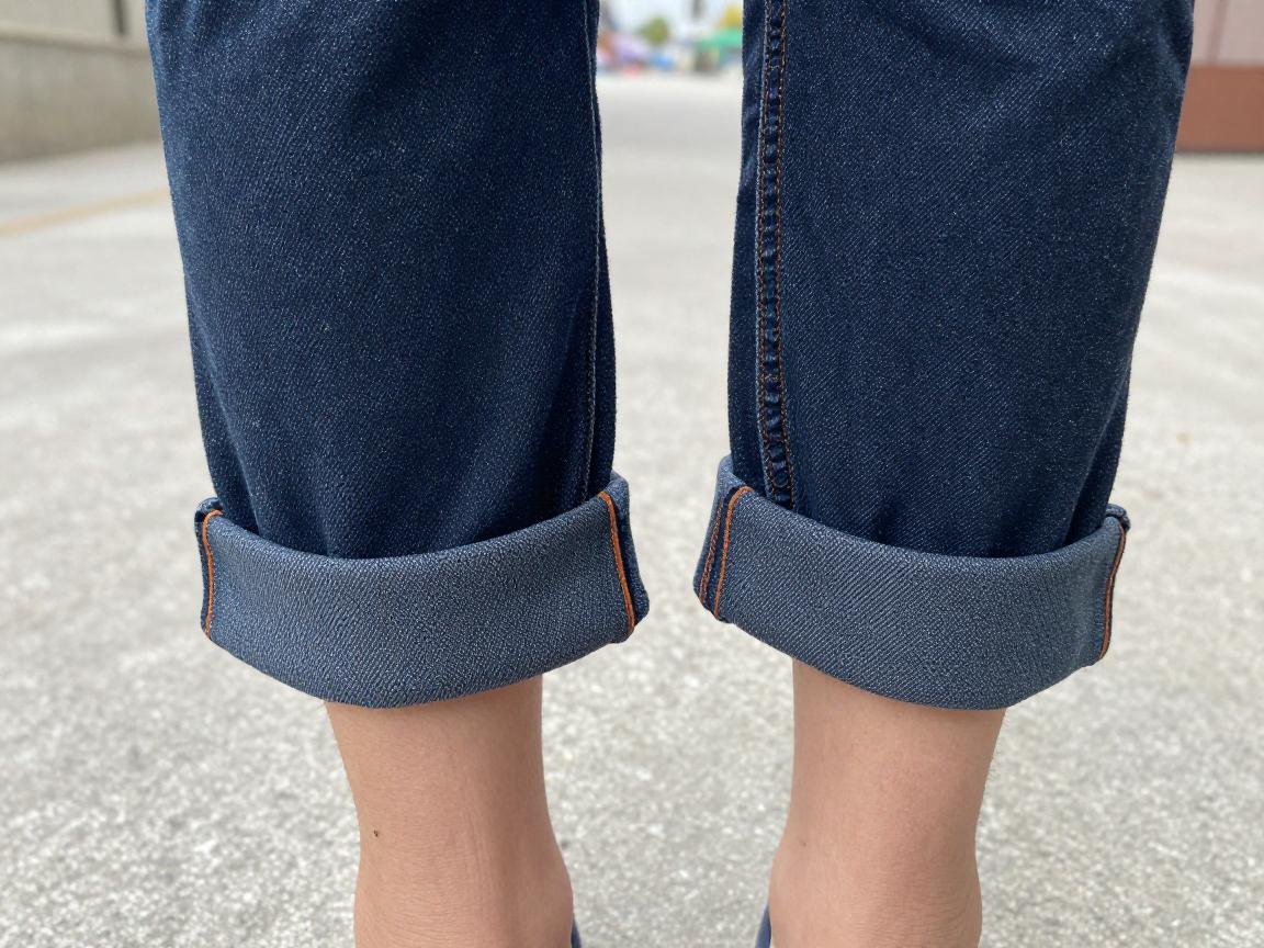 对于硬挺的牛仔、灯芯绒等裤子,直接采用翻折法处理裤脚效果较好。而缎面、雪纺等垂感强的软质面料,则不宜做过多复杂处理,可以让其自然堆积在脚背,形成“堆堆裤”效果。